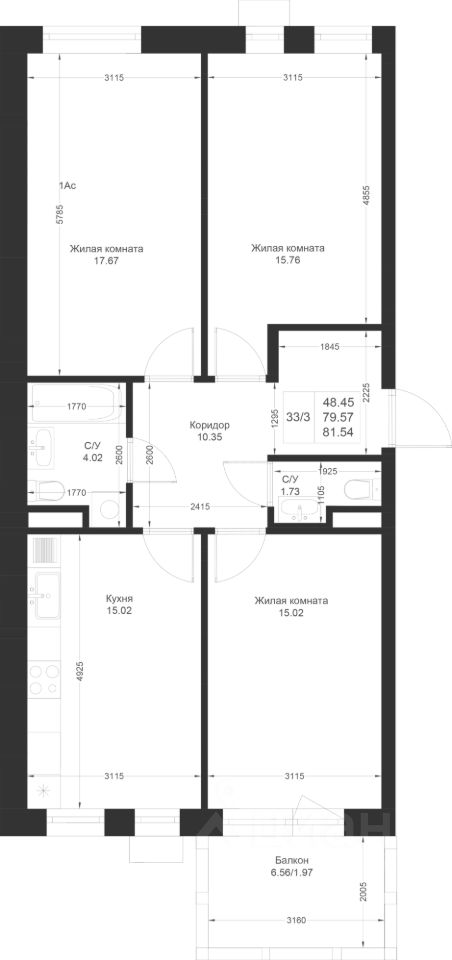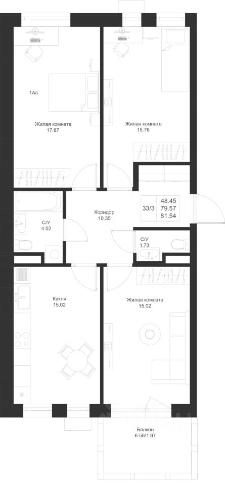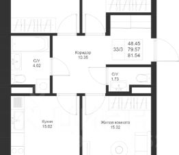Продается 3-комнатная квартира 33 площадью 81,54 кв.м на 2 этаже в строящемся доме проекта "Новый свет" компании "Ак Барс Дом".