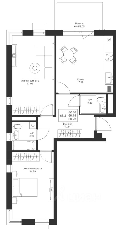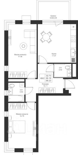 Продается 2-комнатная квартира 68 площадью 68,23 кв.м на 4 этаже в строящемся доме проекта "Новый свет" компании "Ак Барс Дом".