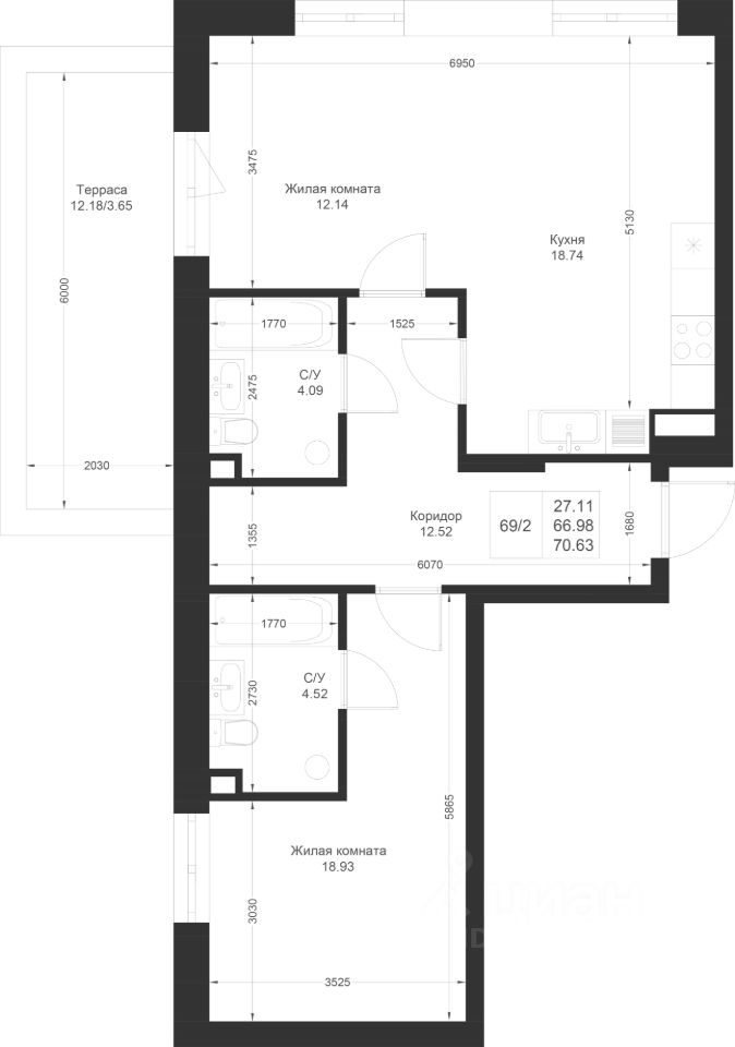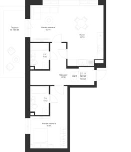 Продается 2-комнатная квартира 69 площадью 70,63 кв.м на 1 этаже в строящемся доме проекта "Новый свет" компании "Ак Барс Дом".