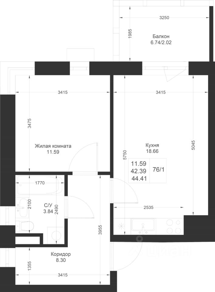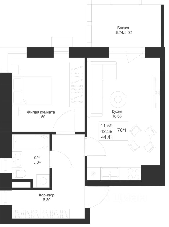 Продается 1-комнатная квартира 76 площадью 44,41 кв.м на 2 этаже в строящемся доме проекта "Новый свет" компании "Ак Барс Дом".