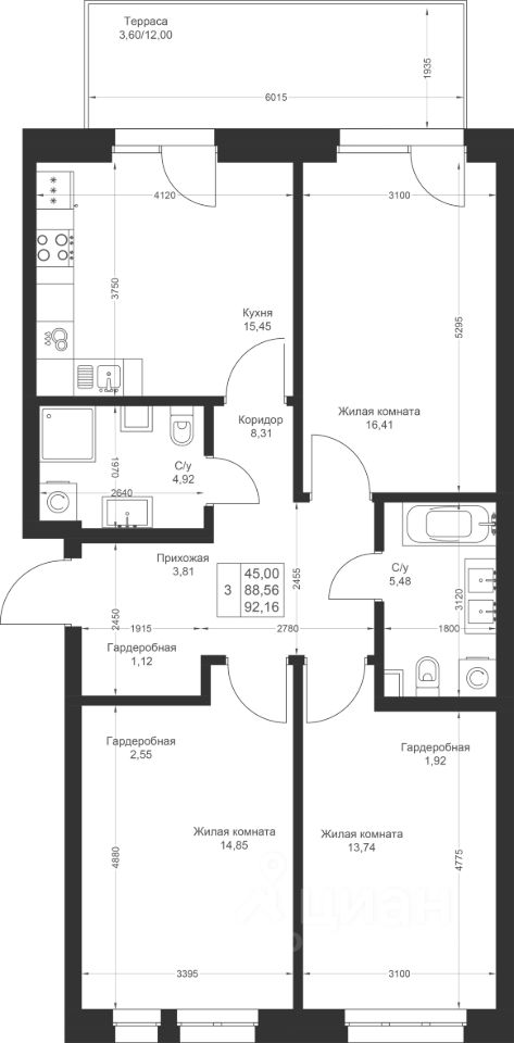 Продается 3-комнатная квартира 3 площадью 92,16 кв.м на 1 этаже в строящемся доме проекта "Новый свет" компании "Ак Барс Дом".