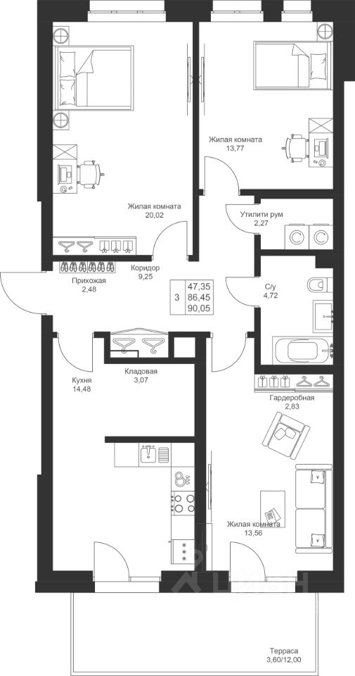 Комфортная 3-комнатная квартира с отдельной кухней и двумя санузлами. В квартире есть просторный балкон, где вы сможете организовать уютное место для отдыха.