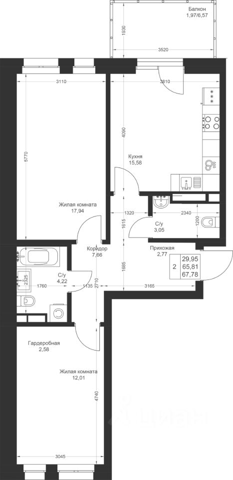 Продается 2-комнатная квартира 61 площадью 67,78 кв.м на 3 этаже в строящемся доме проекта "Новый свет" компании "Ак Барс Дом".