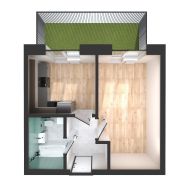 Площадь комнаты позволяет зонировать ее на спальную и гостевую зоны. В проекте функциональная прихожая, чтобы вам было удобно хранить свои вещи.