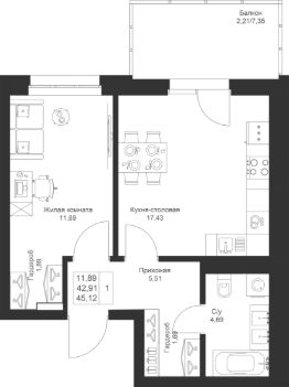 Продается 1-комнатная квартира 73 площадью 45,12 кв.м на 2 этаже в строящемся доме проекта "Новый свет" компании "Ак Барс Дом".