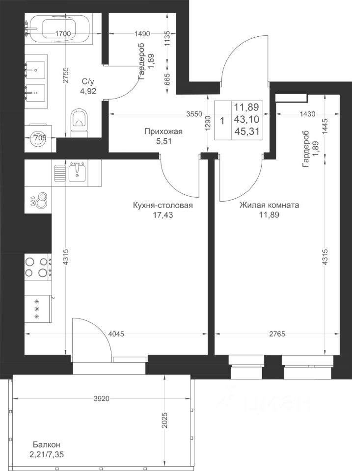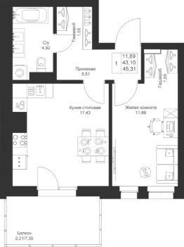 Продается 1-комнатная квартира 96 площадью 45,31 кв.м на 3 этаже в строящемся доме проекта "Новый свет" компании "Ак Барс Дом".