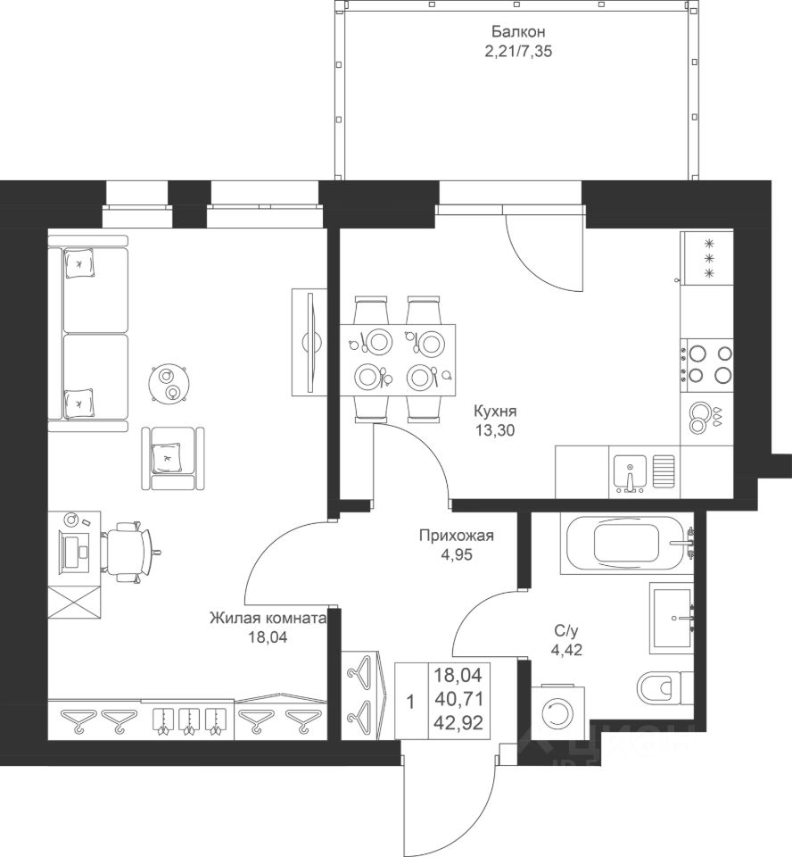 Уютная 1-комнатная квартира с отдельной кухней и выходом на балкон. Здесь можно организовать рабочее место или дополнительное пространство для отдыха.
