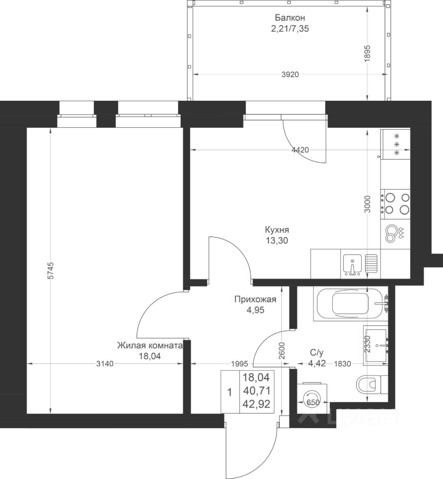 Продается 1-комнатная квартира 102 площадью 42,92 кв.м на 4 этаже в строящемся доме проекта "Новый свет" компании "Ак Барс Дом".