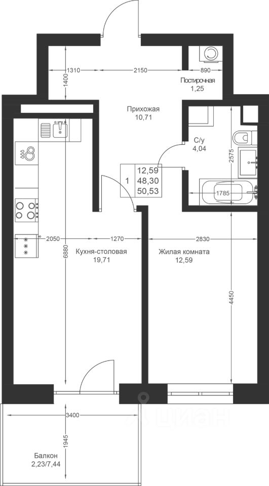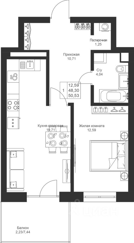 Просторная 1-комнатная квартира с кухней-гостиной, из которой организован выход на балкон. Здесь можно устраивать семейные ужины или встречи с друзьями.
