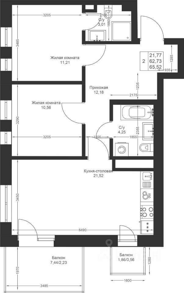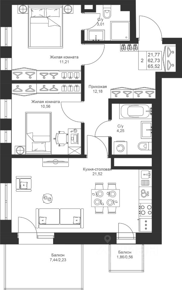 Уютная 2-комнатная квартира с кухней-гостиной и отдельной спальней. На балконе можно обустроить дополнительное место для отдыха или работы. Продуманное зонирование: кухонная зона находится в нише, чтобы скрыть рабочие процессы.