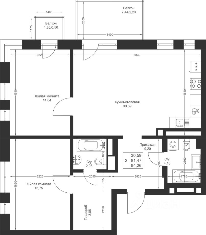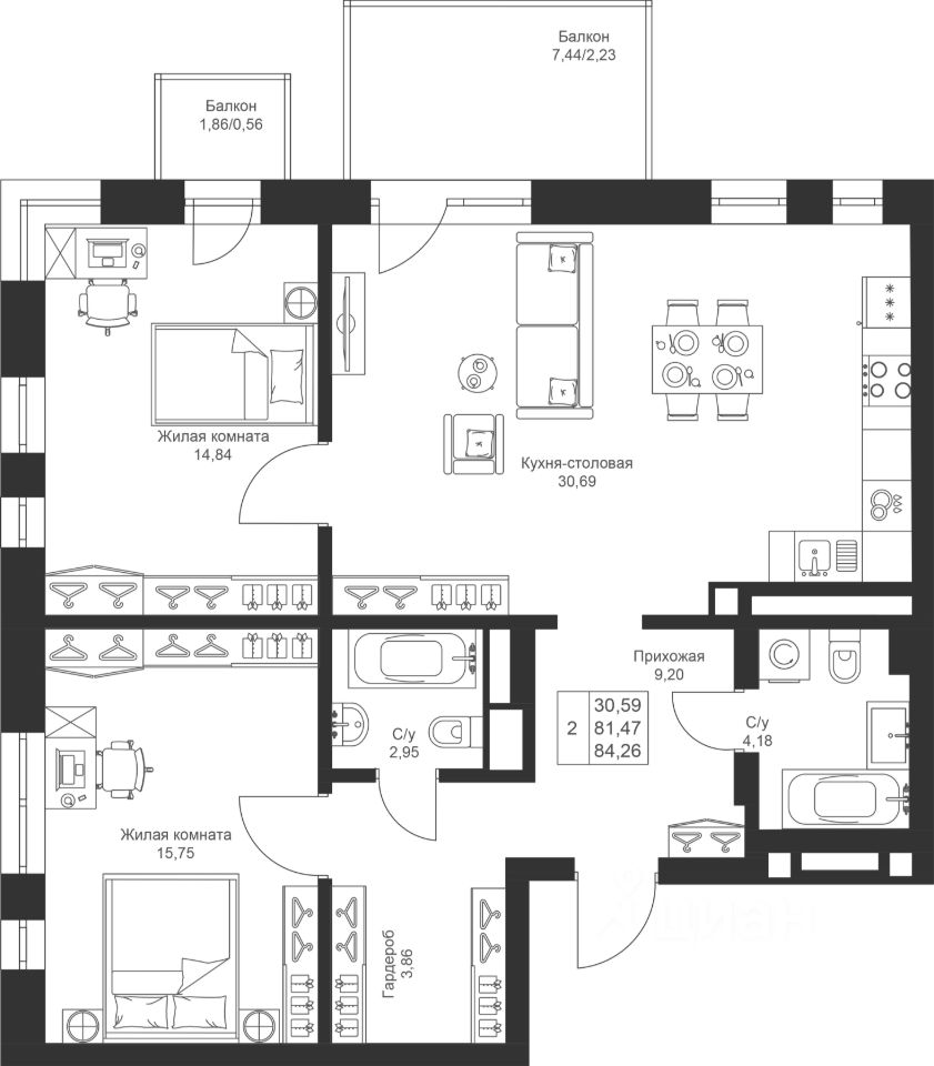 Уютная 2-комнатная квартира с кухней-гостиной и отдельной спальней. На балконе можно обустроить дополнительное место для отдыха или работы. Продуманное зонирование: кухонная зона находится в нише, чтобы скрыть рабочие процессы.
