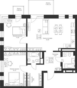 Продается 2 Евро-комнатная квартира 14 площадью 84,26 кв.м на 3 этаже в строящемся доме проекта "Новый свет" компании "Ак Барс Дом".