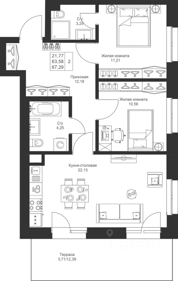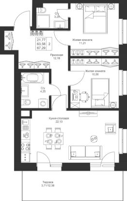 Продается 2 Евро-комнатная квартира 21 площадью 67,29 кв.м на 1 этаже в строящемся доме проекта "Новый свет" компании "Ак Барс Дом".