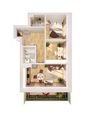 Уютная 2-комнатная квартира с кухней-гостиной и отдельной спальней. На балконе можно обустроить дополнительное место для отдыха или работы. Продуманное зонирование: кухонная зона находится в нише, чтобы скрыть рабочие процессы.