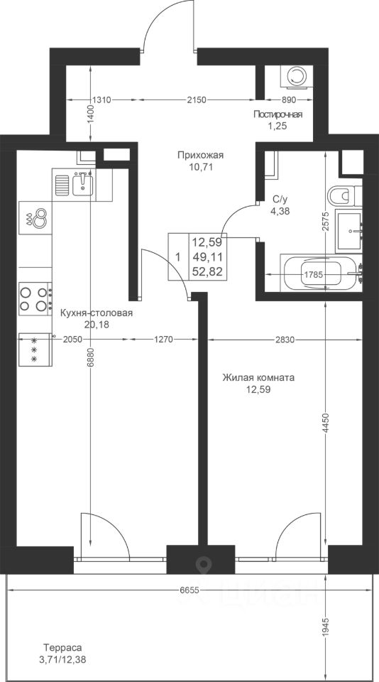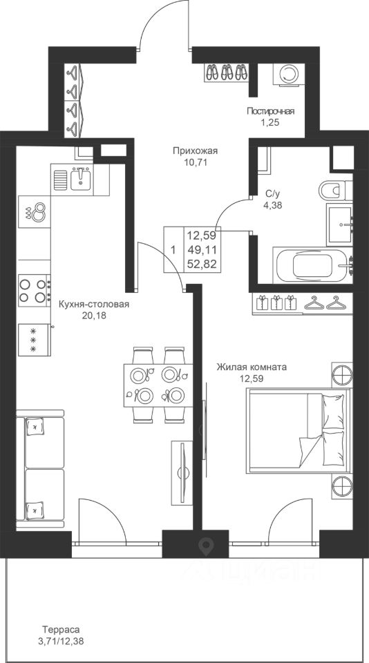 Просторная 1-комнатная квартира с кухней-гостиной, из которой организован выход на балкон. Здесь можно устраивать семейные ужины или встречи с друзьями.