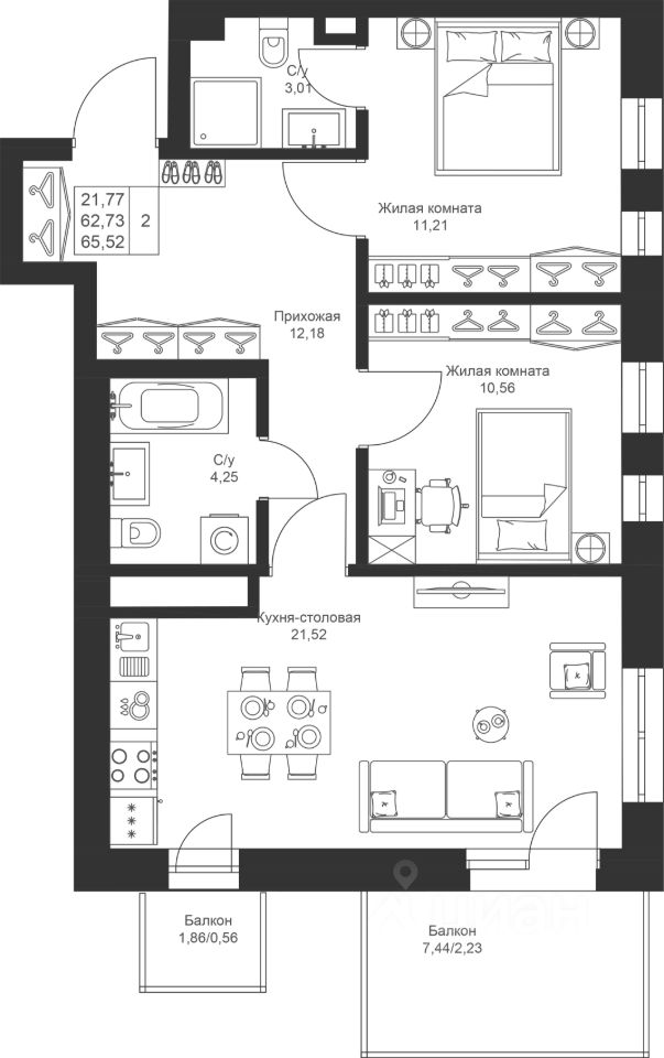 Уютная 2-комнатная квартира с кухней-гостиной и отдельной спальней. На балконе можно обустроить дополнительное место для отдыха или работы. Продуманное зонирование: кухонная зона находится в нише, чтобы скрыть рабочие процессы.