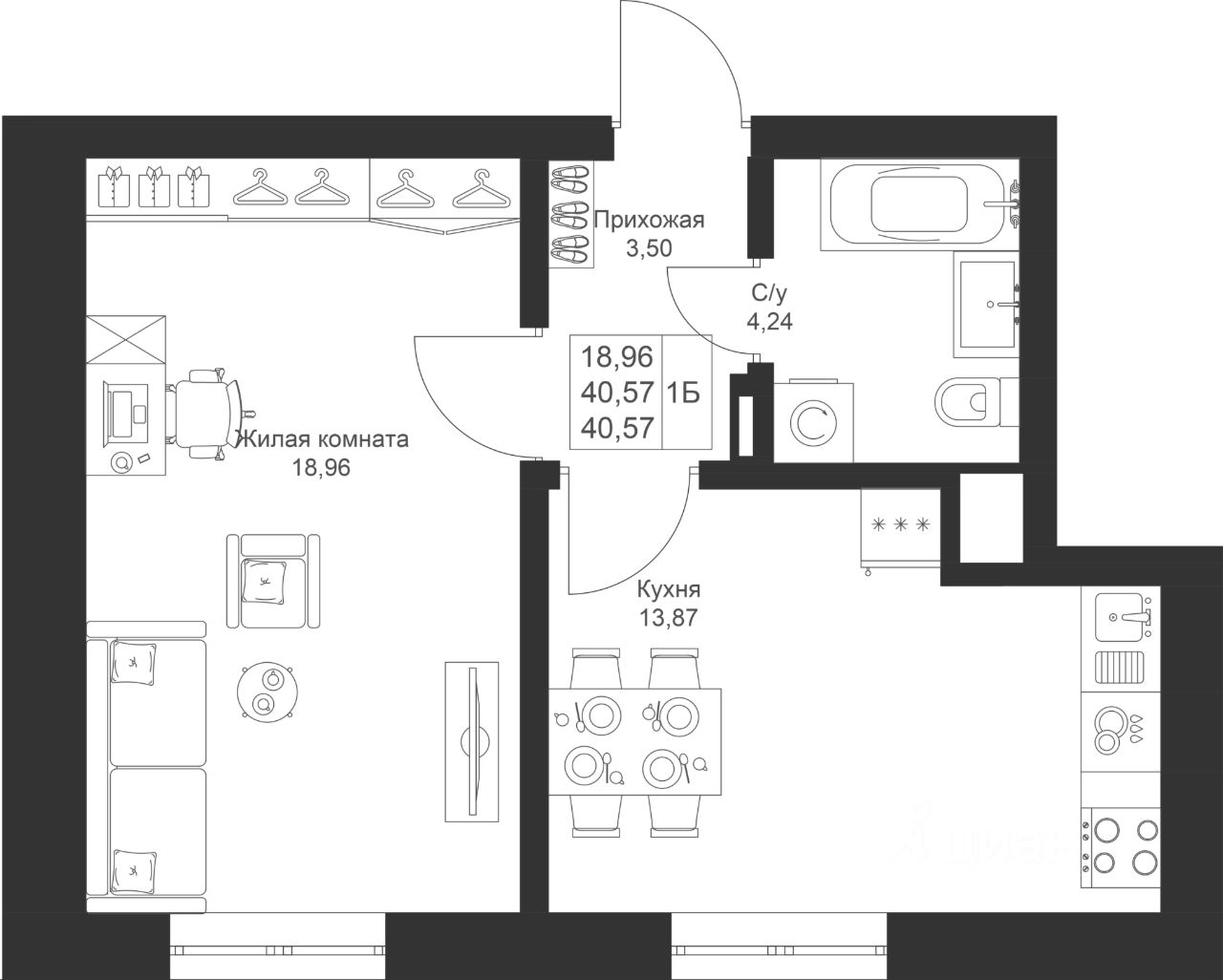 Площадь комнаты позволяет зонировать ее на спальную и гостевую зоны. В проекте функциональная прихожая, чтобы вам было удобно хранить свои вещи.