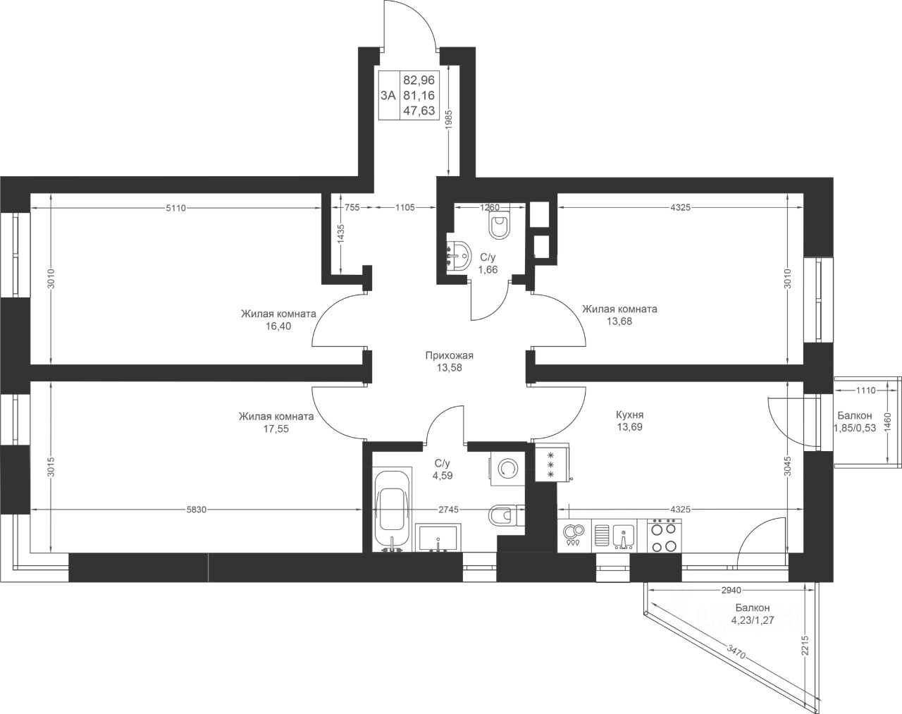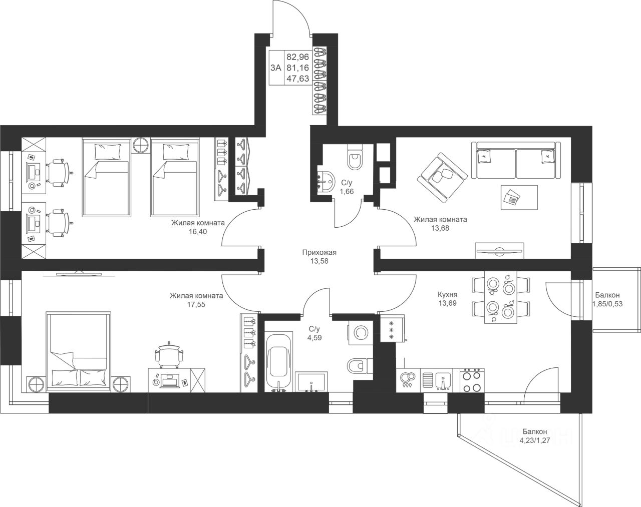 Продается 3-комнатная квартира 107 площадью 82,96 кв.м на 3 этаже в строящемся доме проекта "Новый свет" компании "Ак Барс Дом".