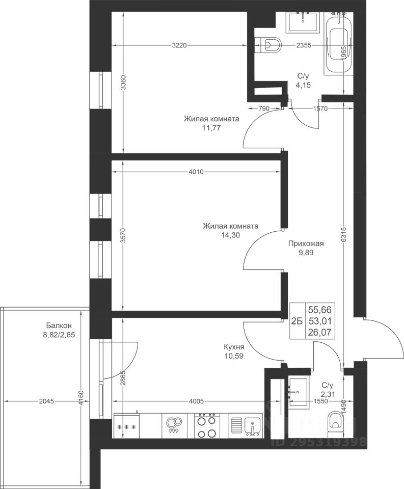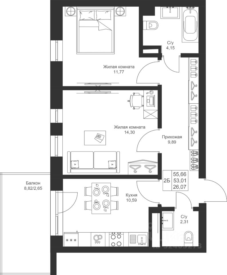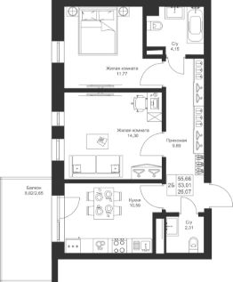 Продается 2-комнатная квартира 109 площадью 55,66 кв.м на 4 этаже в строящемся доме проекта "Новый свет" компании "Ак Барс Дом".