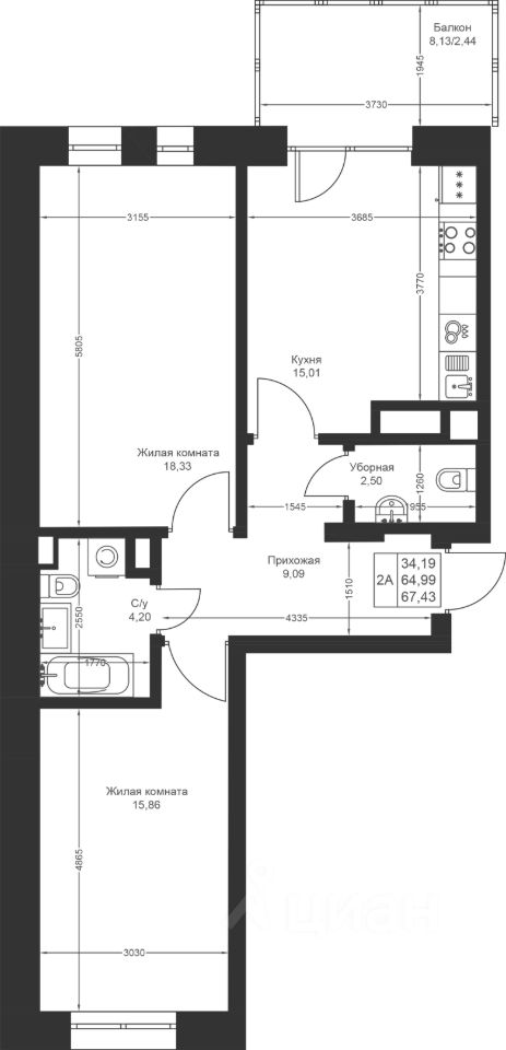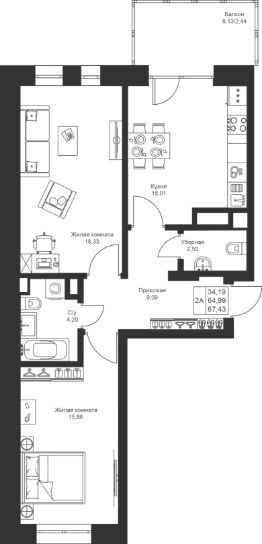 Продается 2-комнатная квартира 160 площадью 67,43 кв.м на 4 этаже в строящемся доме проекта "Новый свет" компании "Ак Барс Дом".