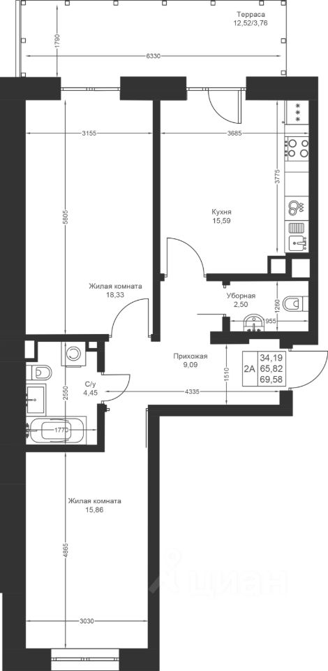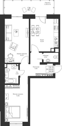 Продается 2-комнатная квартира 163 площадью 69,58 кв.м на 1 этаже в строящемся доме проекта "Новый свет" компании "Ак Барс Дом".