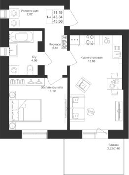 Просторная 1-комнатная квартира с кухней-гостиной, из которой организован выход на балкон. Здесь можно устраивать семейные ужины или встречи с друзьями.