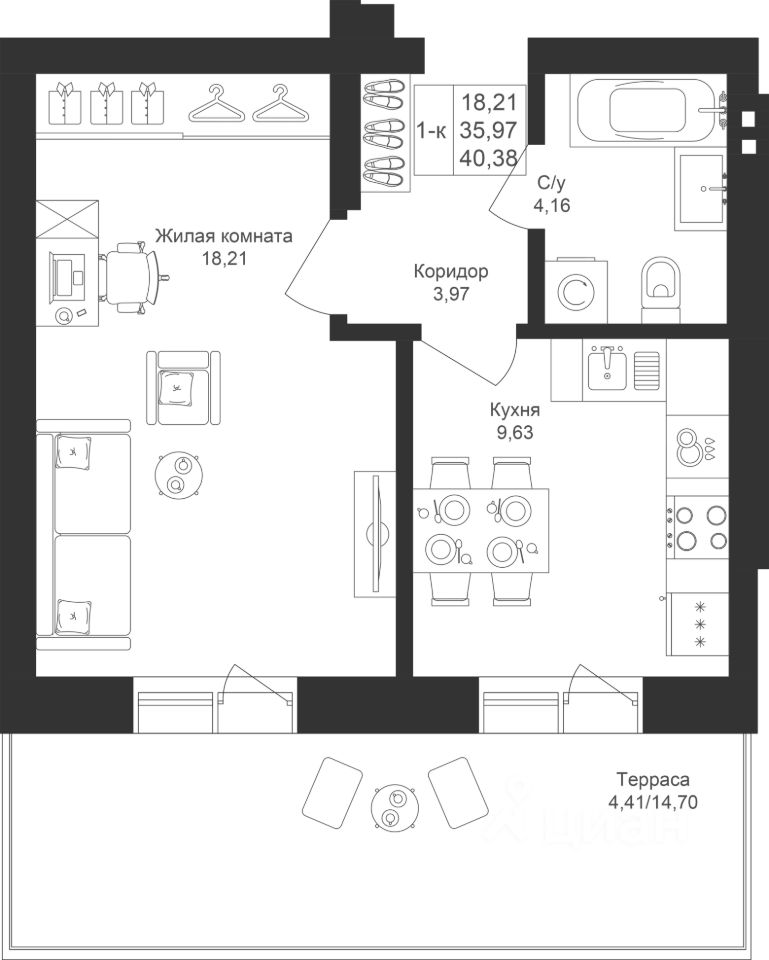 Уютная 1-комнатная квартира с отдельной кухней и выходом на балкон. Здесь можно организовать рабочее место или дополнительное пространство для отдыха.