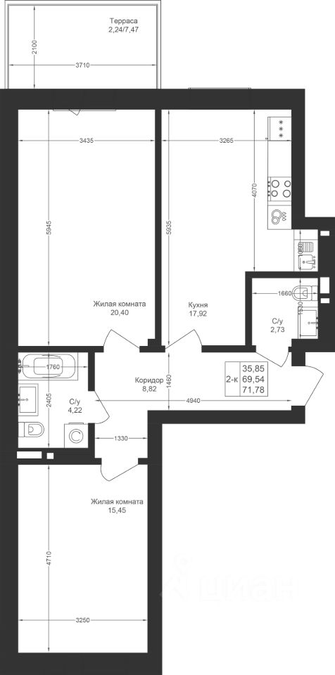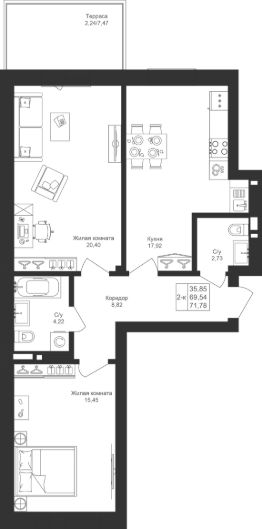 Продается 2-комнатная квартира 78 площадью 71,78 кв.м на 1 этаже в строящемся доме проекта "Новый свет" компании "Ак Барс Дом".