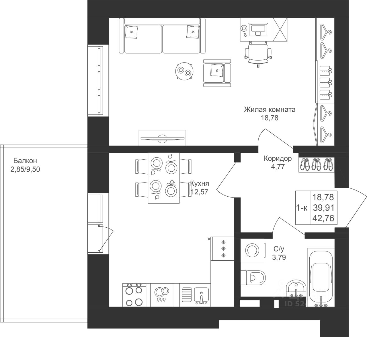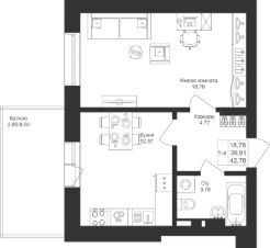 Продается 1-комнатная квартира 91 площадью 42,76 кв.м на 4 этаже в строящемся доме проекта "Новый свет" компании "Ак Барс Дом".