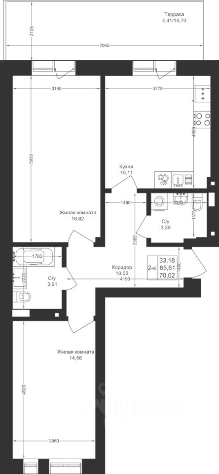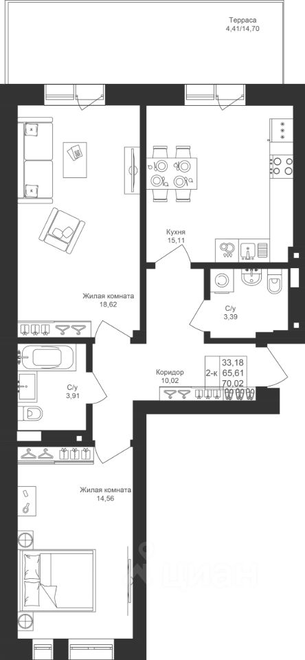 Продается 2-комнатная квартира 99 площадью 70,02 кв.м на 1 этаже в строящемся доме проекта "Новый свет" компании "Ак Барс Дом".
