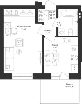 Продается 1-комнатная квартира 106 площадью 38,27 кв.м на 3 этаже в строящемся доме проекта "Новый свет" компании "Ак Барс Дом".