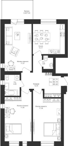 Продается 3-комнатная квартира 140 площадью 85,32 кв.м на 4 этаже в строящемся доме проекта "Новый свет" компании "Ак Барс Дом".