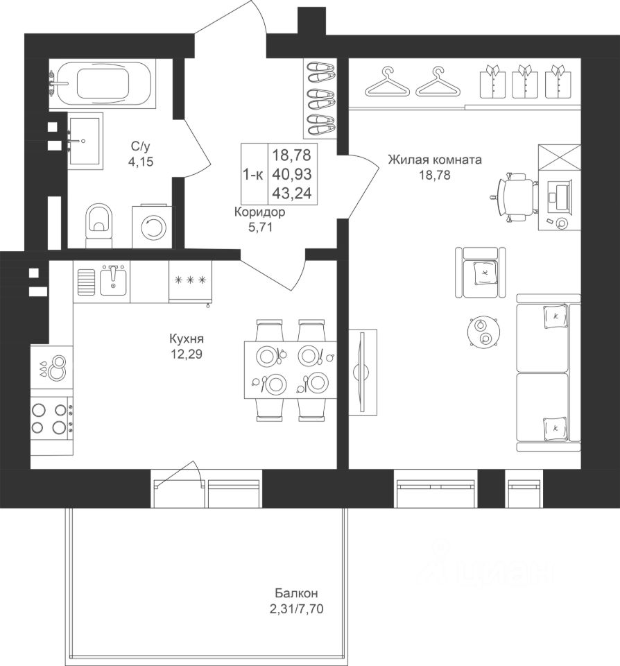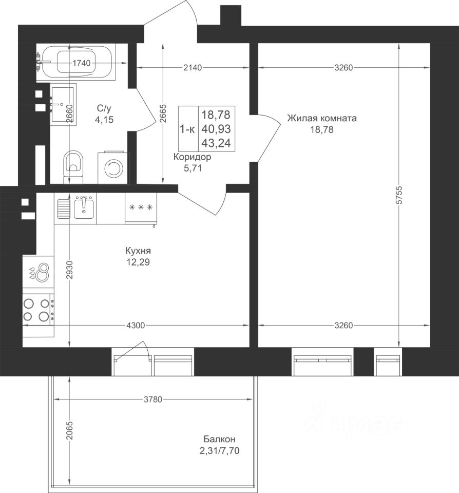 Продается 1-комнатная квартира 143 площадью 43,24 кв.м на 4 этаже в строящемся доме проекта "Новый свет" компании "Ак Барс Дом".