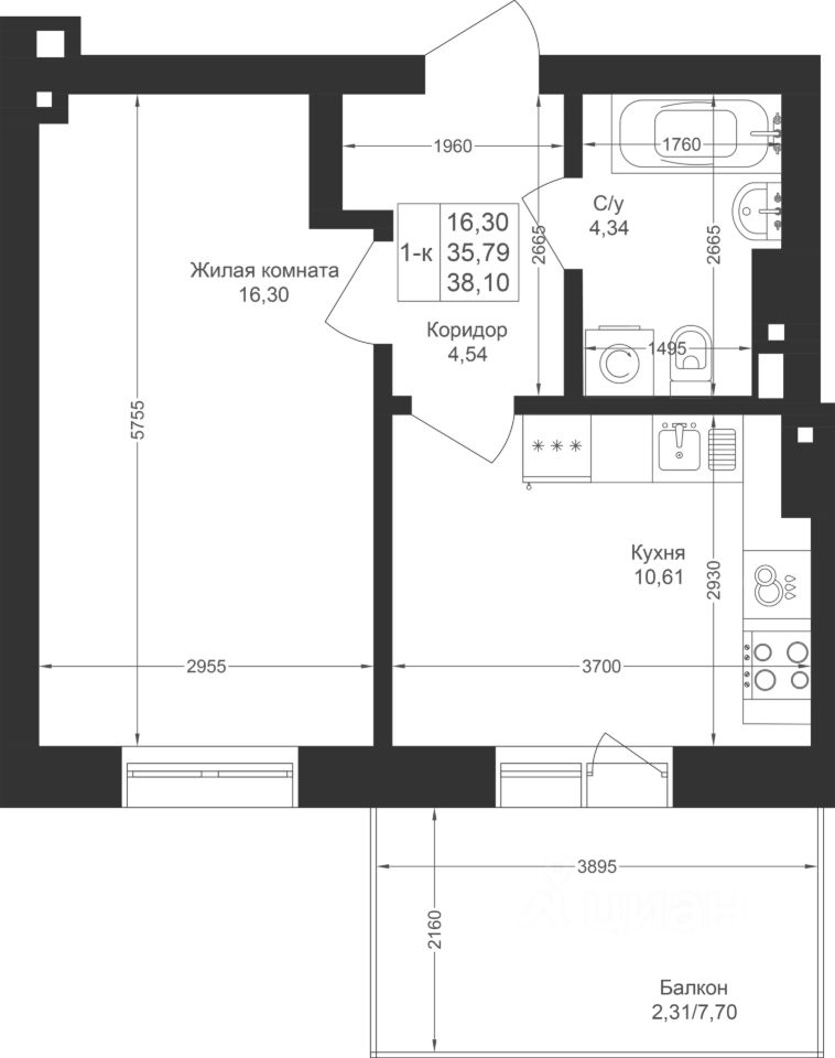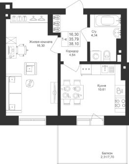 Продается 1-комнатная квартира 170 площадью 38,1 кв.м на 3 этаже в строящемся доме проекта "Новый свет" компании "Ак Барс Дом".