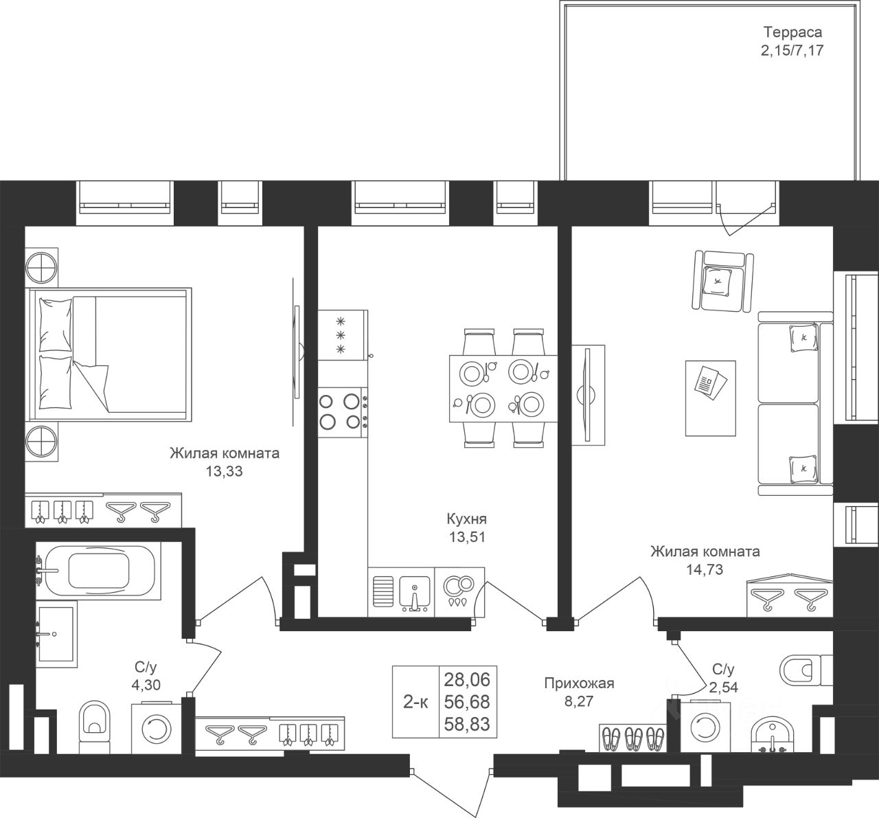 Продается 2-комнатная квартира  222 площадью 58,83 кв.м на 1 этаже в строящемся доме проекта "Новый свет" компании "Ак Барс Дом".