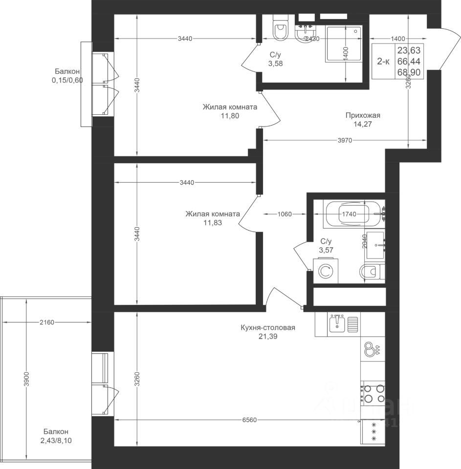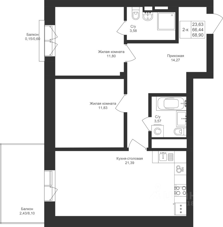 Продается 2-комнатная квартира 230 площадью 68,9 кв.м на 3 этаже в строящемся доме проекта "Новый свет" компании "Ак Барс Дом".