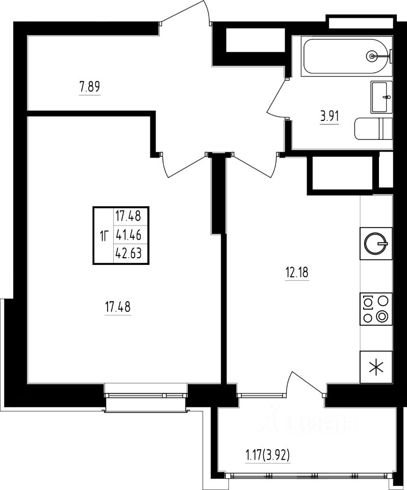 Продается 1 комнатная квартира 133 общей площадью: 42.63 кв.м. на 12 этаже 19 этажного дома.