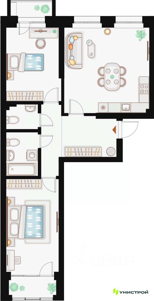 В квартирах выполняется предчистовая отделка с использованием качественных материалов: металлические двери, тепло- и шумоизоляция, энергоэффективные стеклопакеты, скрытая разводка коммуникаций и радиаторы с терморегуляцией.