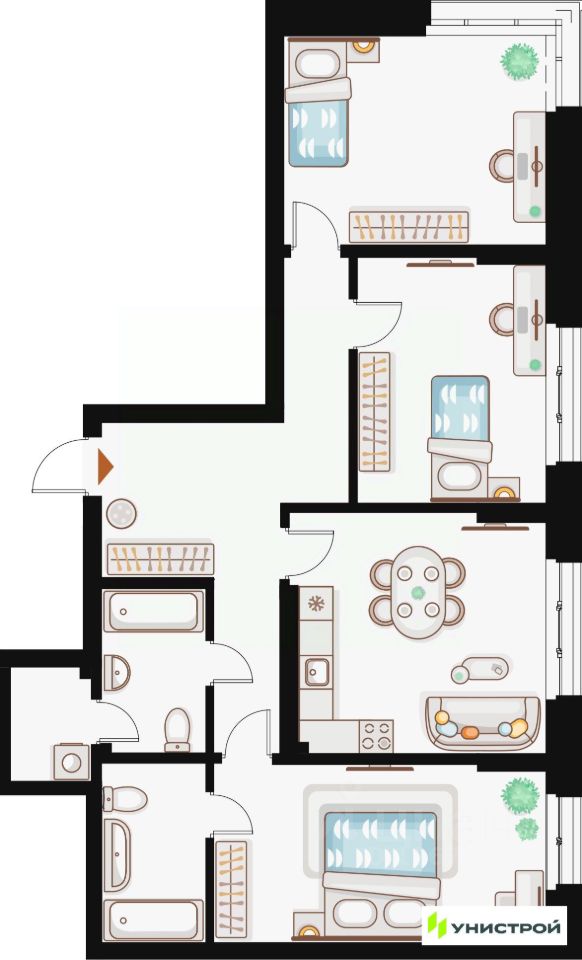 В квартирах выполняется предчистовая отделка с использованием качественных материалов: металлические двери, тепло- и шумоизоляция, энергоэффективные стеклопакеты, скрытая разводка коммуникаций и радиаторы с терморегуляцией.