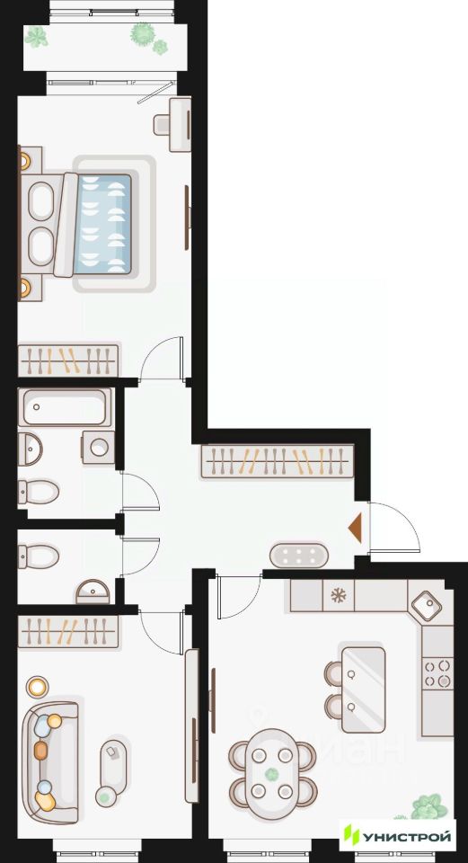 В "Q на Кулагина" предлагаются квартиры с террасами, евроварианты с просторными кухнями-гостиными, мастер-спальнями с ванными и гардеробными, тёплыми лоджиями и эркерами. На верхних этажах террасы позволяют любоваться видом на Волгу и Гребной канал.