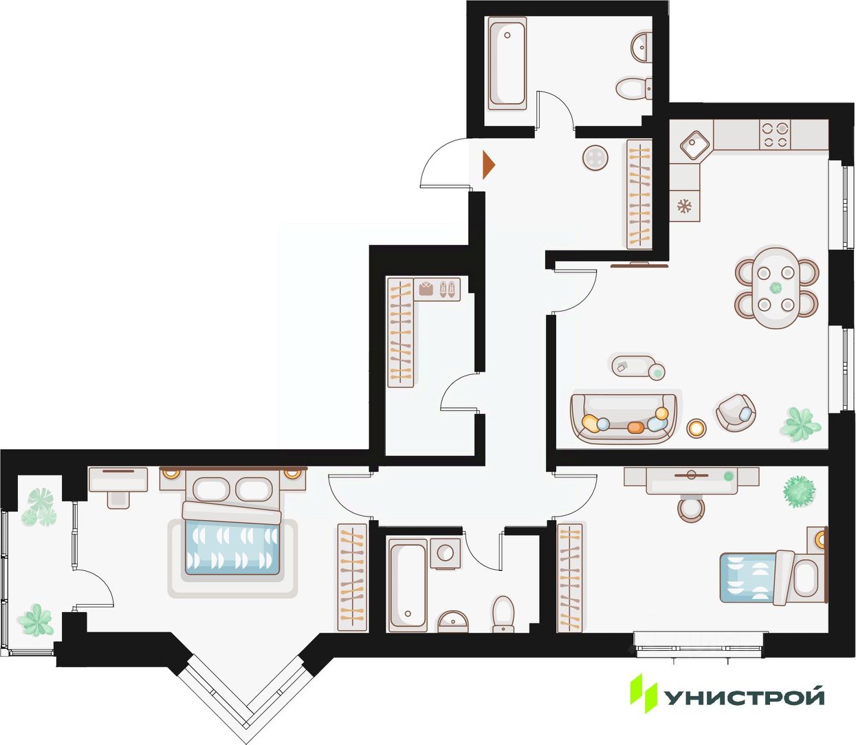 В квартирах выполняется предчистовая отделка с использованием качественных материалов: металлические двери, тепло- и шумоизоляция, энергоэффективные стеклопакеты, скрытая разводка коммуникаций и радиаторы с терморегуляцией.