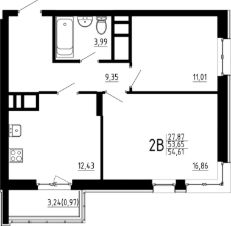 Продается 2комнатная квартира 19 общей площадью: 54.61 кв.м. на 4 этаже в 1 секции 23 этажного дома.