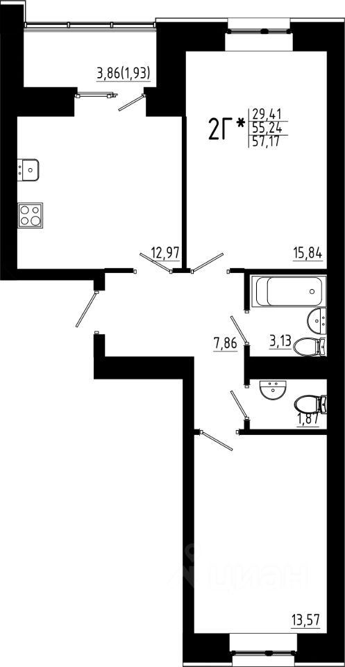 Продается 2комнатная квартира 205 общей площадью: 57.17 кв.м. на 7 этаже в 3 секции 9 этажного дома.