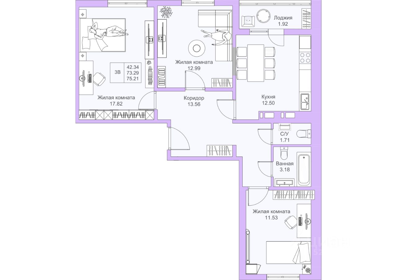 Продается 3-комнатная квартира 241 площадью 75,21 кв.м на 18 этаже проекта "Светлая долина" строительной компании "Ак Барс Дом". Купить квартиру можно в ипотеку со ставкой от 3,2% или воспользоваться услугой trade-in.
