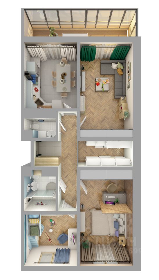 Комфортная 3-комнатная квартира с большой кухней и 2-мя санузлами. В проекте - увеличенная лоджия для любых проектных решений. Правильная геометрия жилых комнат позволит удобно разместить мебель.