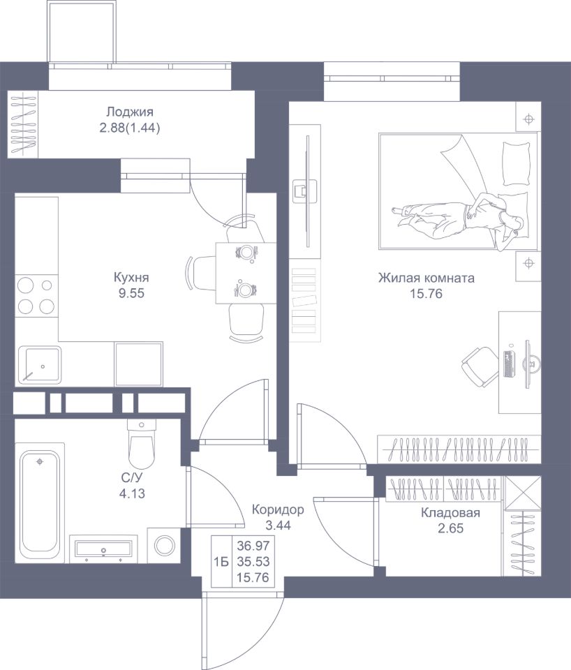 Просторная 1-комнатная квартира с гостиной в 16 кв.м. Отдельная кухня, из которой открывается выход на лоджию увеличенного размера. Высокие потолки 2,7 м, правильная геометрия комнат для удобной меблировки. В прихожей есть отдельная кладовая комната, где будет удобно разместить полки и хранить вещи.