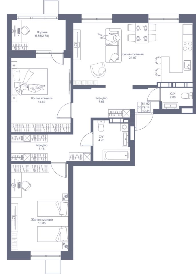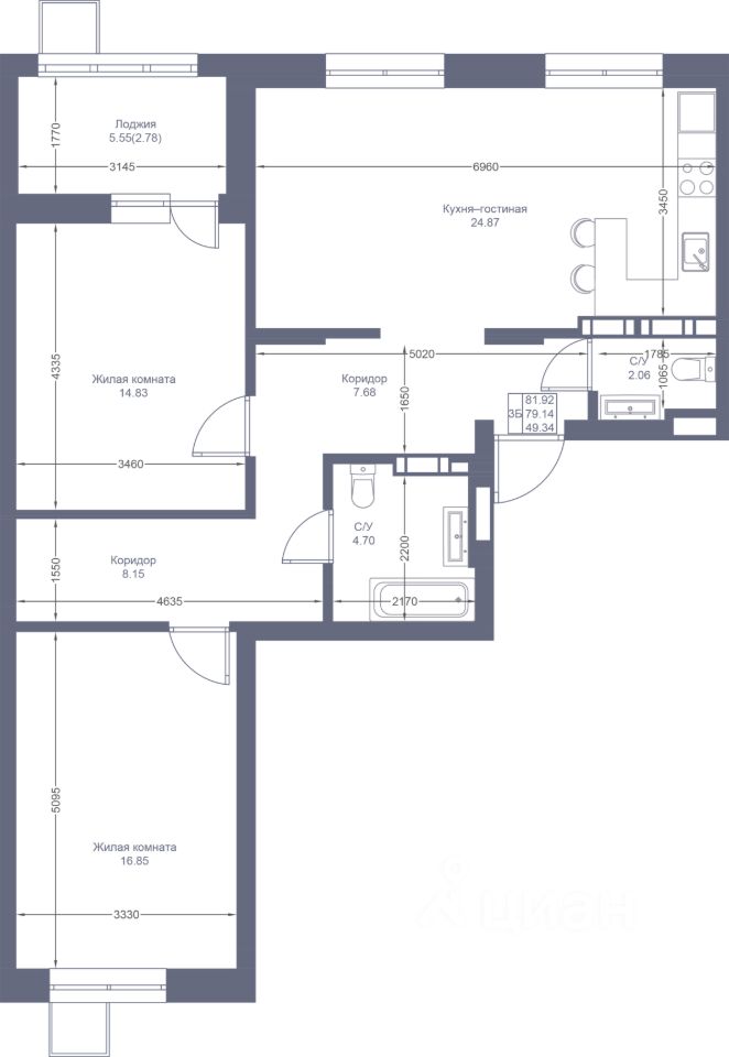 Просторная 3-комнатная квартира с евро-кухней, где вся семья может собираться за большим столом. В проекте 2 отдельные комнаты для личного пространства домочадцев.