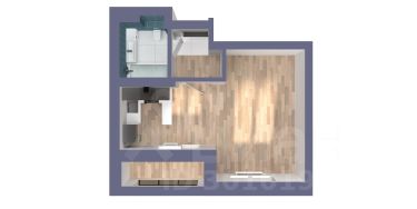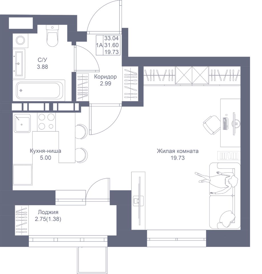 Просторная квартира - студия с гостиной в 19,73 кв.м. Отдельная кухня, из которой открывается выход на лоджию увеличенного размера. Высокие потолки 2,7 м, правильная геометрия комнат для удобной меблировки. В прихожей достаточно места для создания вместительной гардеробной.