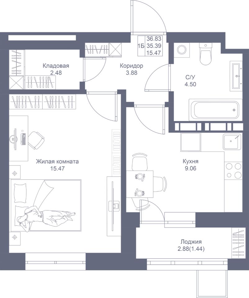 Просторная 1-комнатная квартира с гостиной в 16 кв.м. Отдельная кухня, из которой открывается выход на лоджию увеличенного размера. Высокие потолки 2,7 м, правильная геометрия комнат для удобной меблировки. В прихожей есть отдельная кладовая комната, где будет удобно разместить полки и хранить вещи.