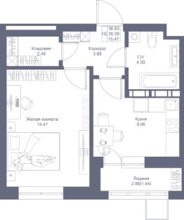 Продается 1-комнатная квартира 257 площадью 36,83 кв.м на 2 этаже 17-ти этажного дома проекта "Мой Ритм" от "Ак Барс Дом". Купить квартиру можно в ипотеку со ставкой от 4,5%.